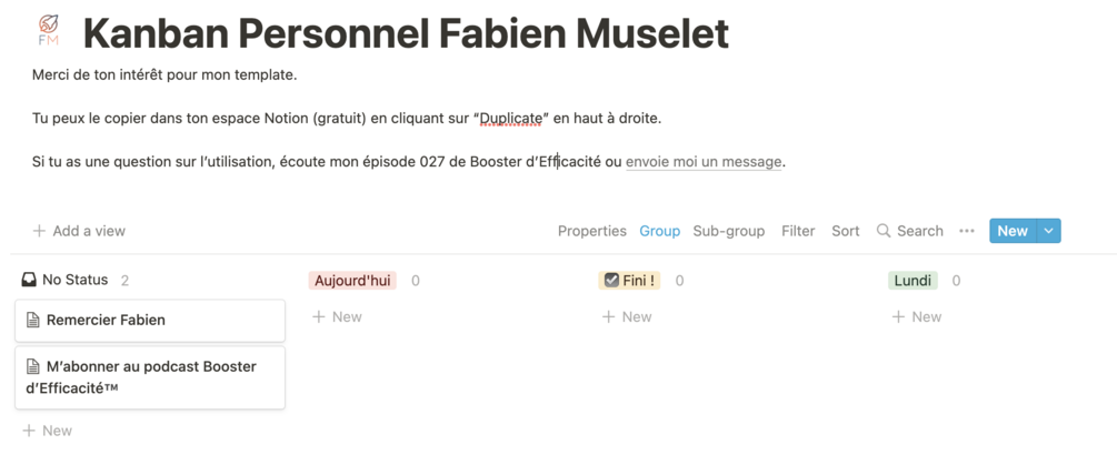 Avec ce template offert issu de mon podcast Booster d'Efficacité (épisode 27), tu obtiendras ton modèle de Kanban personnel à dupliquer directement dans ton espace Notion.